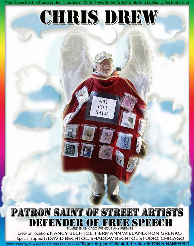 Chris, artist and defender of the First Amendment, gave his life and dedicated his energies to overturn the Peddler’s Licence. But this challenge unbelievably ended up facing a Class One Felony Eavesdropping charges with 4-15 years in prison.-(in 2008 for audio recording his own arrest!) if convicted but he won with 2 probono attorneys Weinberg and Kutnick! THIS is a true story. Rooted in Chicago – my indie film, “Free Speech & the Transcendent Journey of Chris Drew, Street Artist” (99 min) with the soundtrack of “Paper Airplane” by Alton & Mansfield courtesy of Hey Now Records. has very deep/grassroots connections which transcends boundaries!