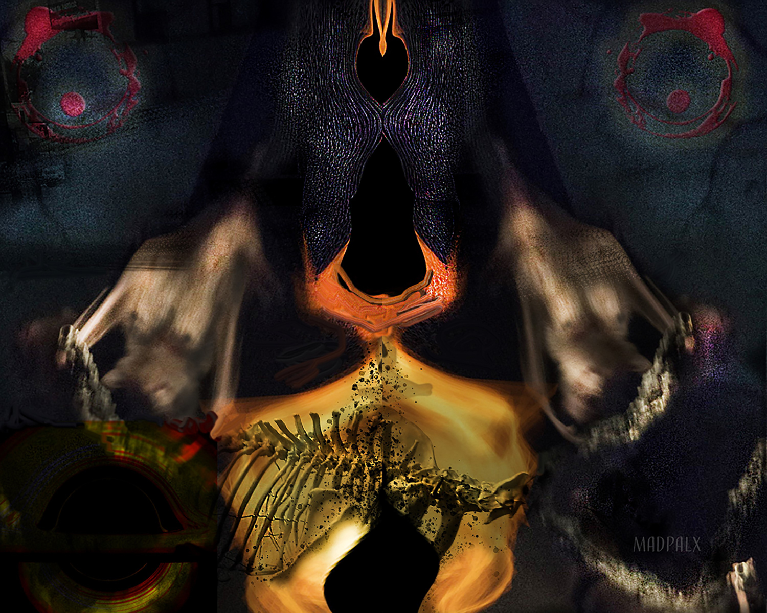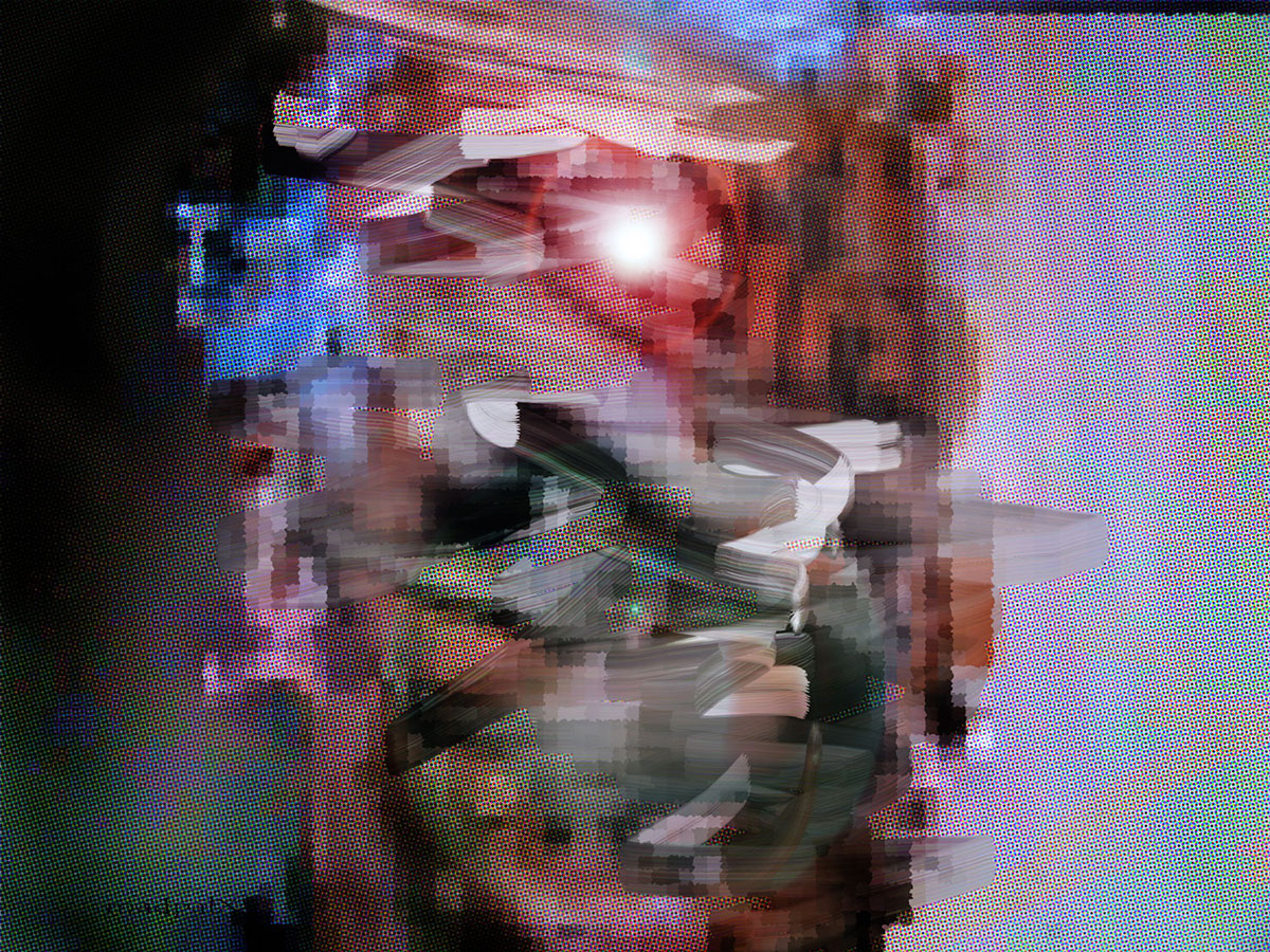 Keeping pace with tribal rhythms from the drum circle, images of dancers and the swirling colors of their mind-bending regalia are sliced, diced, and reassembled in eye-opening ways. These fragments are shuffle played in structural designs which suggest both the beating of the heart and similar movements occurring in Nature.