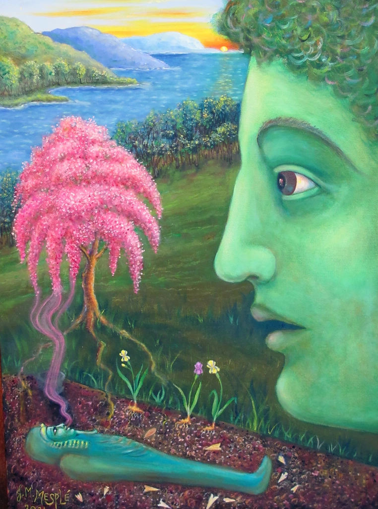 This painting was inspired by the poem “Renascence” by Edna St. Vincent Millay. Ancient Myths, Poetry, and Music inspire my visionary, narrative paintings. As a child, my maternal grandfather told me stories drawn from his Osage (Native American) heritage, creating a bridge to the Classical world, since both cultures are animistic seeing Spirits in everything.