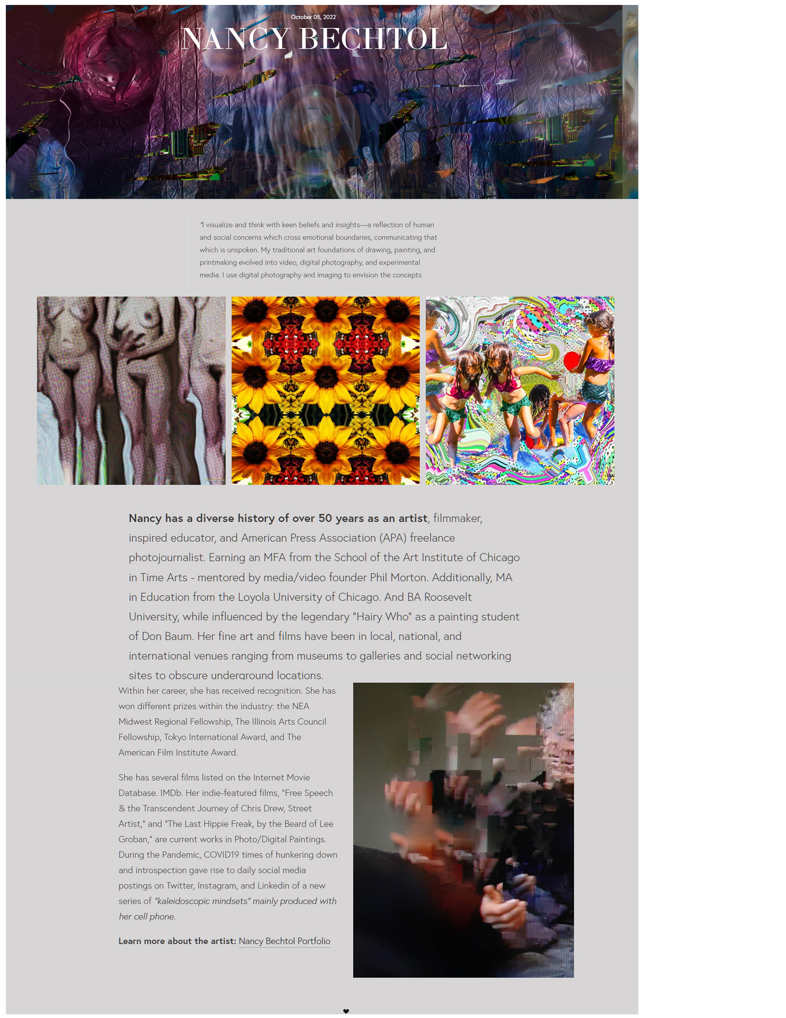 Chicago woman artist whose work spans several media, decades and styles. This work has natural formations but you also get the sense of the urban. They contain their own universe. You see an intensity . Earlier in her career, she studied painting with Don Baum, artist and curator, and was influenced by the Hairy Who, and the Chicago Imagists. With an MFA from the School of the Art Institute of Chicago, she was inspired and mentored by pioneering video artist Phil Morton, founder of the Video Area. “My art is really a mixed bag. I adapt to whatever works for the concept. I work in digital media, photography and video, both experimental and documentary style. As an artist I often reinvent myself.”