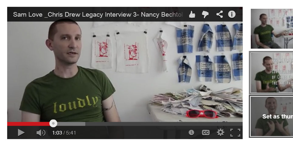 Sam Love was deeply involved with the www.artpatchproject.org, as are a dedicated group of supporters, Mess Hall and Area Chicago. In this video clip, he recounts the unusual connection between– Chris Drew, musician, vs Chris Drew, Street Artist — and how the fans and supporters became “shared”–funny but true!This video is in a series of people sharing insights to the artist/activist and his life.